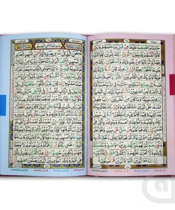 876-7S Holy Quran Tajweedi Velvet Pink – 16 Line Quran – Pink and Rainbow Quran Pak – Taj Company Quran